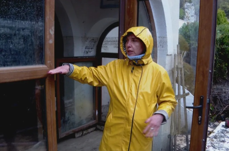 „Тук беше спалнята и водата оттук влезе. Там имах на много красив двор. Електричество, вода и интернет няма, извинете, че не мога да предложа кафе“, казва още тя.