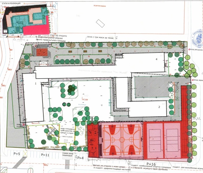 Предвижда се осигуряване на достъпна среда в двора и на западния вход на гимназията. Създаване на нови площи с богато озеленяване, включително и дървесни видове. Благоустрояване на нови места за отдих и общуване чрез монтаж на паркова мебел – пейки и слънцезащитна пергола. Осигуряване на достъп до новия вход на двора в прилежащата на училището пространство чрез изграждане на тротоар и уширение в него пред входа, както и да се прецизират и разчертаят паркоместа, при отлагане на действащата улична регулация за квартала и при съобразяване със съществуващи и новопредвидени пешеходни алеи, с които да се улесни и скъси достъпът до училището.