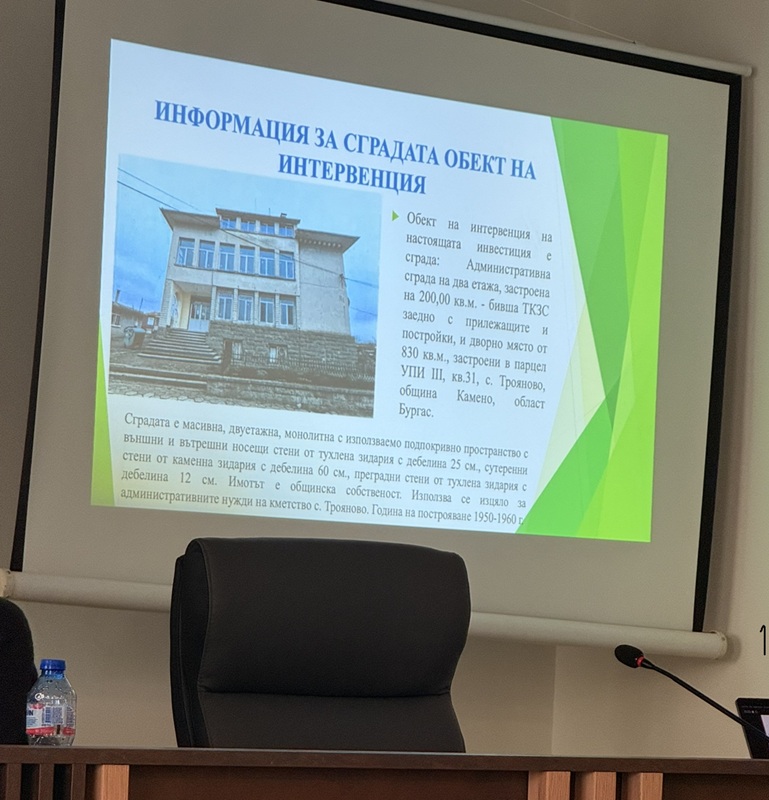 На 17.10.2025 г. в Община Камено се проведе финална пресконференция по проект № BG-RRP-4.020-0113 с наименование „Устойчиво енергийно обновяване на административна сграда – с. Трояново, община Камено“, финансиран по процедура BG-RRP-4.020 „Подкрепа за устойчиво енергийно обновяване на публичен сграден фонд за административно обслужване, култура и спорт“, посредством Механизма за възстановяване и устойчивост.