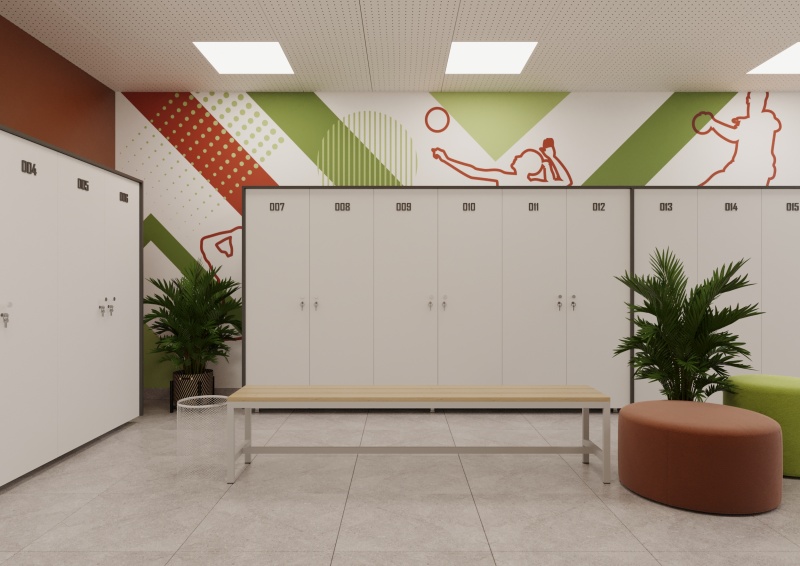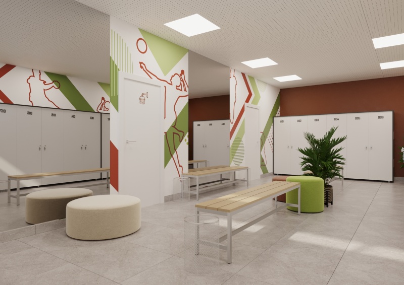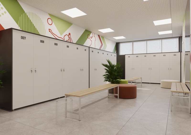 Обзавеждане за съблекални, включващо малка и голяма пейка; табуретки; стойка за кашпа от метална конструкция в черно; гардероб с шкафчета; метално кошче в сребристосив цвят; огледала; стикери за стена; аксесоари за тоалетна и умивалници.