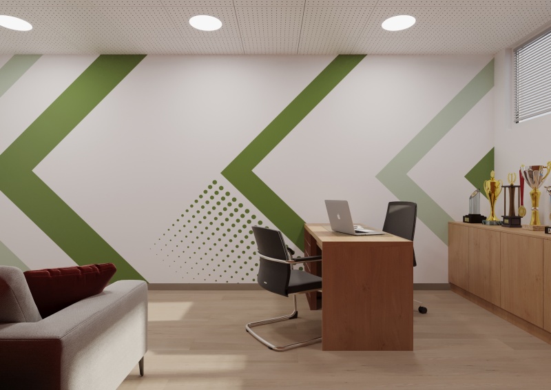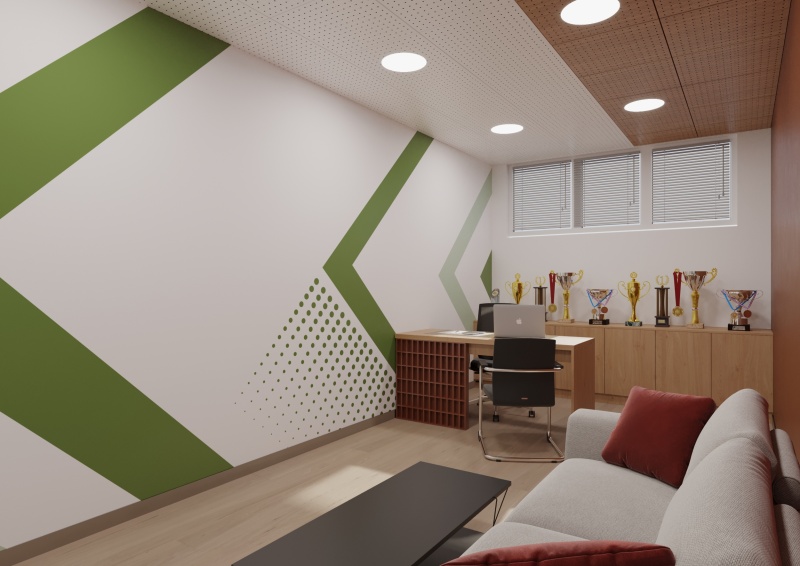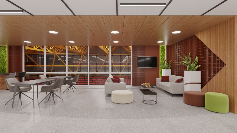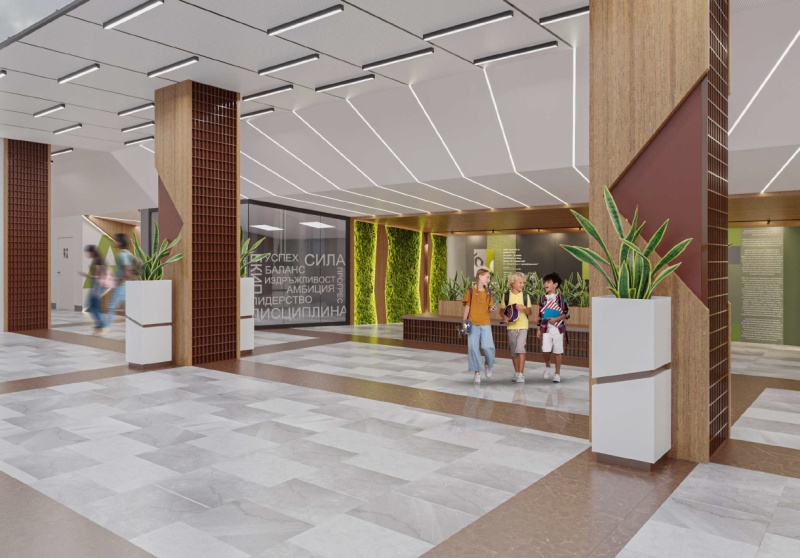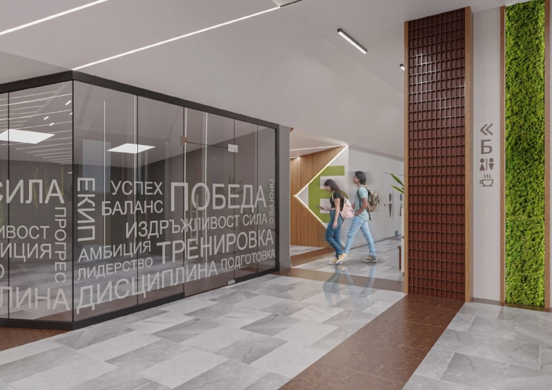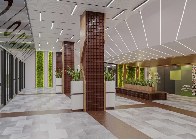 Горно фоайе, в което ще има декоративна колона, облечена от две страни с ПДЧ натурален дъб; три декоративни панела; стена от декоративен скандинавски мъх с окачени панели; две пейки; кашпа за цвете; информационни пана от плексиглас; винилови стикери за визуална идентичност; тоководеща осветителна шина с черен цвят; LED прожектори с насочено осветление.
