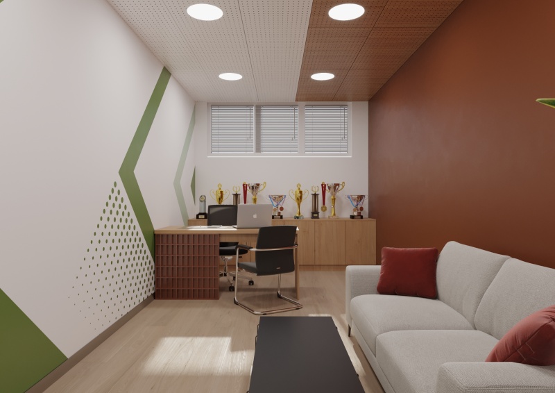 За кабинетите ще се доставят ергономичен офис стол, изработен в комбинация от дамаска и мрежа, със здрава полиамидна основа в черен цвят; посетителски стол; двуместен диван на метални крачета с тапицирани конструкция седалка и подлакътници и възглавници в светлосив цвят; табуретки; кашпа за цвете; бюро от ПДЧ дървесно натурален дъб с цвят шоколад; помощен шкаф; огледала; закачалка за дрехи; разноцветни винилови стикери за стена; аксесоари за WC.