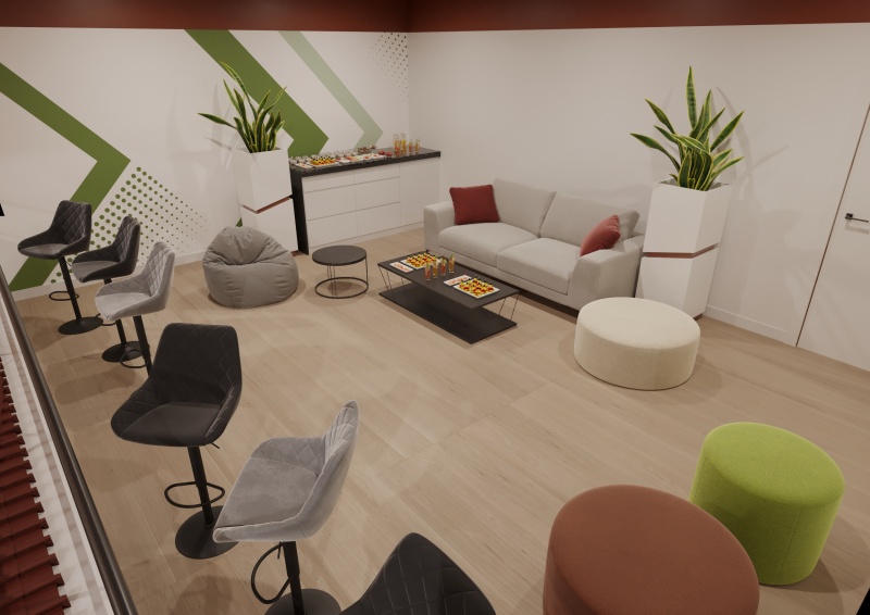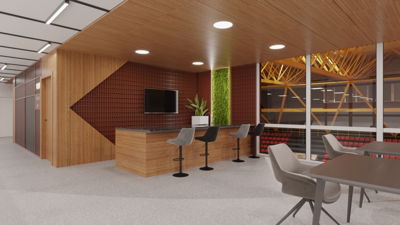 ВИП ложата ще бъде обзаведена с четири декоративни стени, облечени с ПДЧ натурален дъб; бар; две стени от декоративен скандинавски мъх; растер; тапицирани кръгли табуретки; диван с износоустойчива дамаска в светлосив цвят; ниска метална маса в черно; кашпа за цвете; трапезен стол, въртящ се на 360°; бял помощен шкаф; маса с ламинирана плоскост в тъмен орех и метални крака в черен цвят; два бар стола; барплот; два парапета – стъклен и метален; винилови стикери за стена.