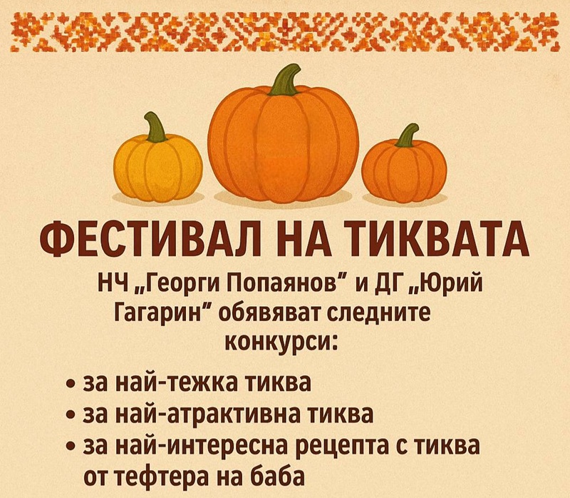 НЧ „Георги Попаянов 1914“ и ДГ „Юрий Гагарин“ канят всички жители и приятели на Малко Търново да се включат в най-веселото есенно предизвикателство – Фестивала на тиквата 2025!