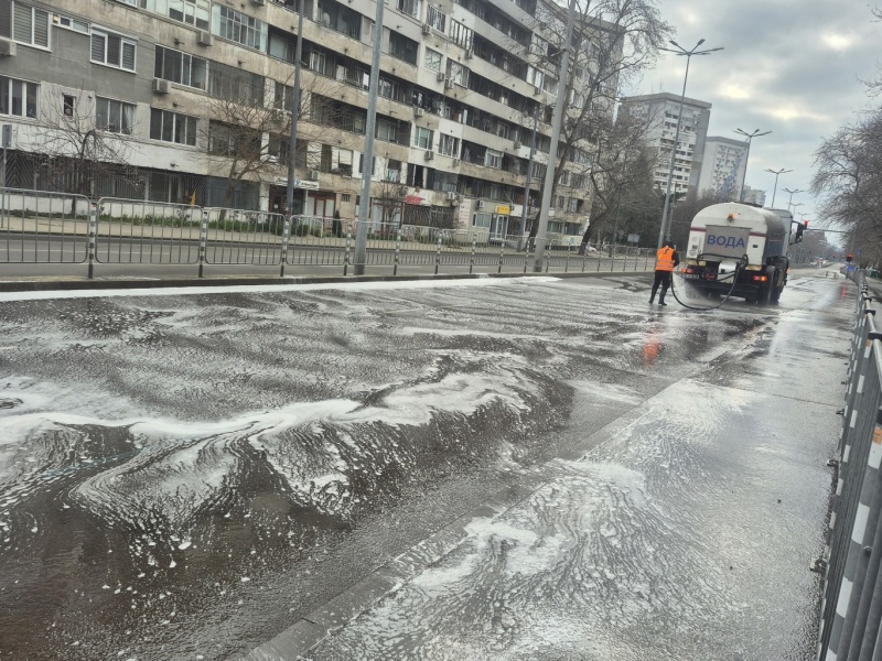 Специализирани екипи обработиха пътното платно и прилежащите площи, като измиването беше извършено с почистващи препарати за по-ефективно отстраняване на натрупаните замърсявания.