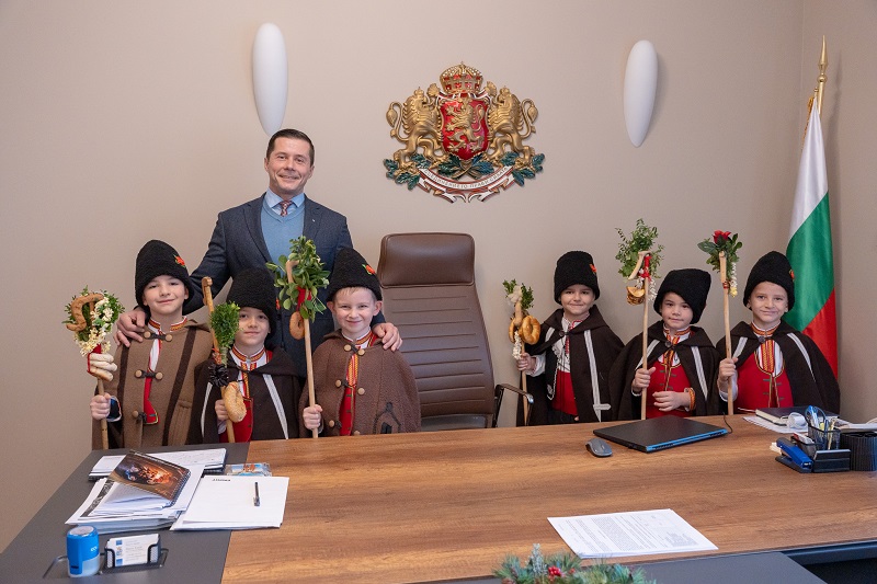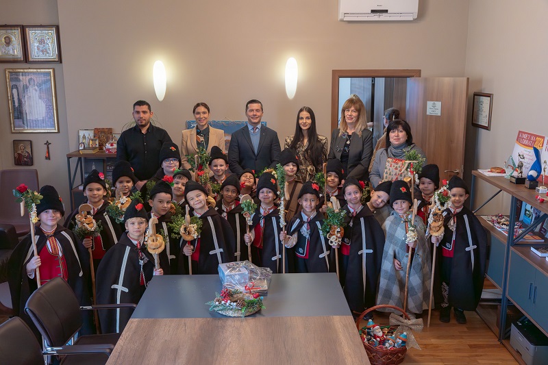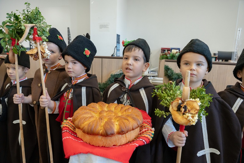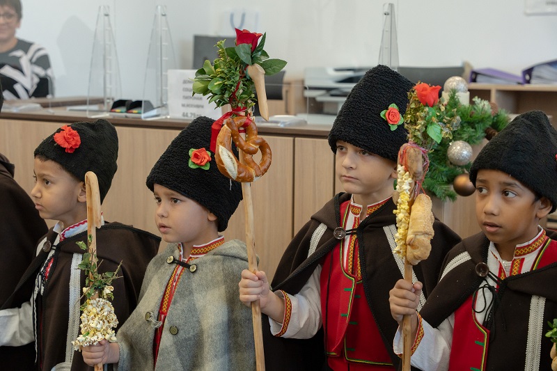 Децата, облечени в автентични български носии, пресъздадоха духа на българския обичай „Коледуване“, като внесоха топлина и радост в административната сграда на общината.
