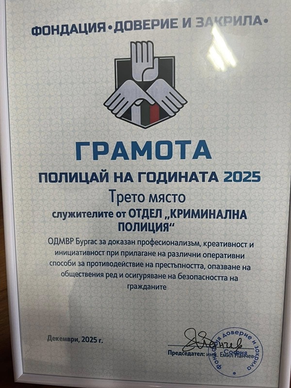 Служителите от отдел "Криминална полиция" към ОДМВР Бургас бяха отличени с колективна трета награда в традиционната церемония "Полицай на годината“, проведена днес в София.