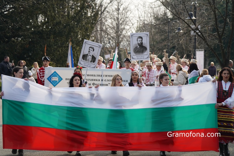 Начело на колоната момичета в народни носии носеха голям трибагреник. Зад тях следваха духовият оркестър на ПГЕЕ „К. Фотинов“ и гвардейците на училището.