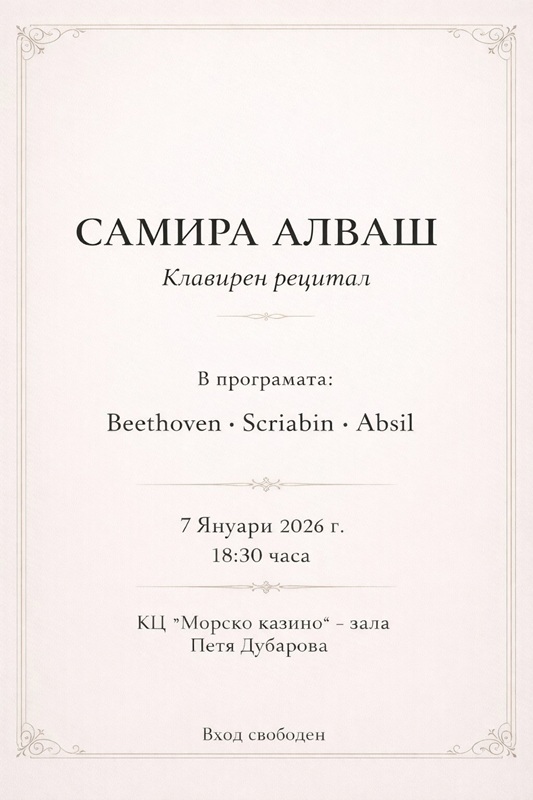 Една бургазлийка се завръща от Италия за да зарадва бургаската публика с изпълненията си на пиано. Концертът на професионалната пианистка Самира Алваш ще бъде на 7 януари 2026 г. От 18.30 часа в Морското казино на Бургас. Ето още информация, която ще ви запали да се порадване на вълшебната музика на професионалната пианистка: