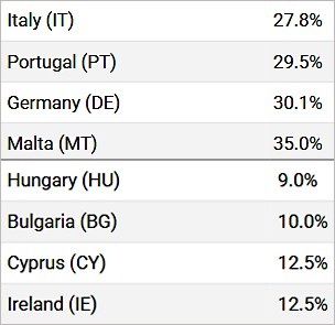 Като се вземат предвид централните и субцентралните данъци, Малта има най-високата законоустановена ставка на корпоративния данък – 35%. Германия, Португалия и Италия следват съответно с 30,06%, 29,5% и 27,8%.