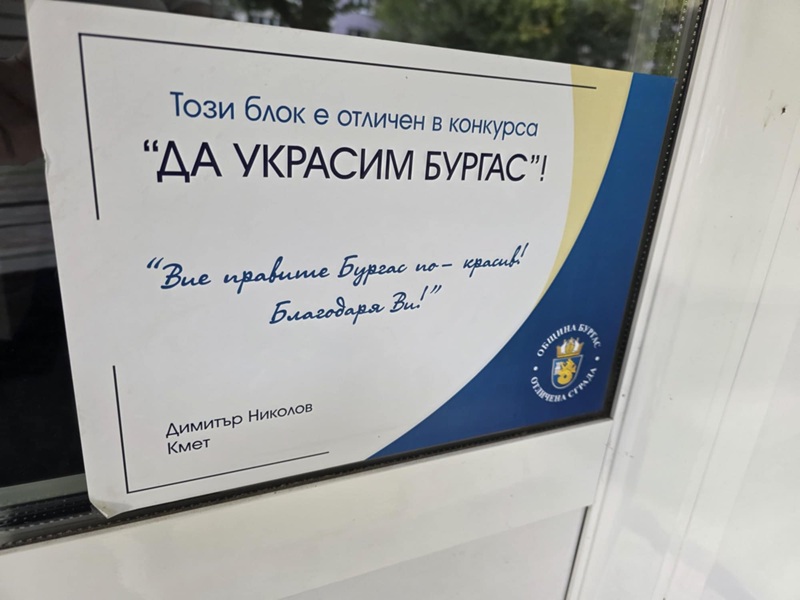 Тази красота е забелязана и отличена в конкурса на общината „Да улрасим Бургас“ и поздравлението от кмета Димитър Николов гордо посреща и изпраща собствениците на апартаменти в този вход. По-трудно се оказва обаче запазването на тази градинка – освен ежедневни грижи по отглеждането на различните видове цветя, трябва да се пази и от посегателство на хората.