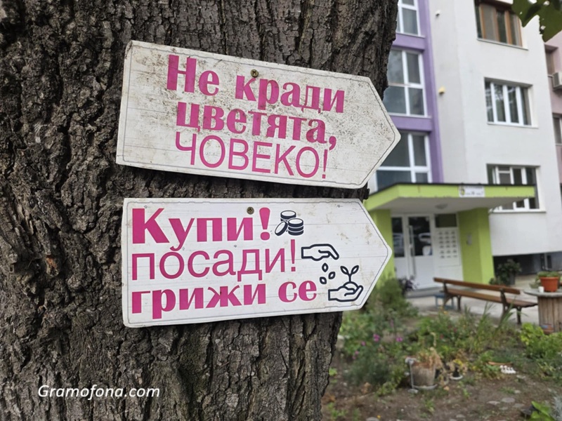 Затова на преден план идват предупредителни табели, в едната е изписано „Не кради цветята, ЧОВЕКО!“, като е наблегнато на думата човек. А другата е с поучителен надпис: „Купи, посади, грижи се!“.