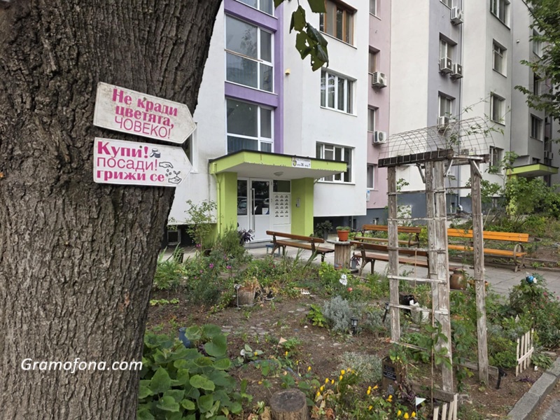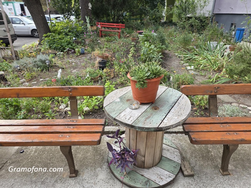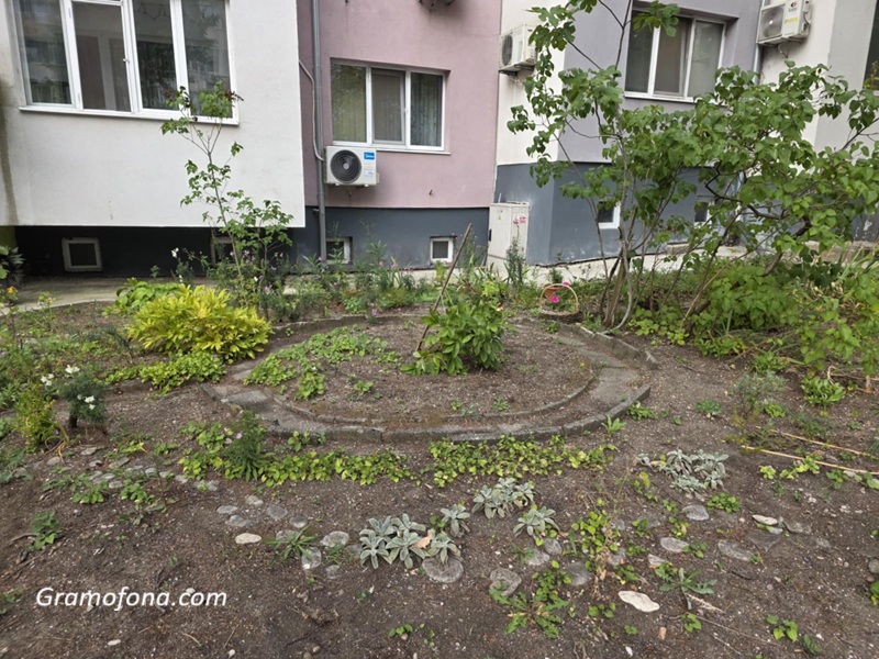 Тази идилична картина, напомняща за домашен уют, е сътворена пред панелен блок в Бургас. Това е блок 36 в комплекс „Славейков“. Планирана и осъществена от две дами, които живеят в 7-ми вход, резултатът е истински оазис и храм на спокойствието. Съчетавайки различни елементи, като цветя, декорация, камъни, мулч, дамите са създали истински шедьовър.