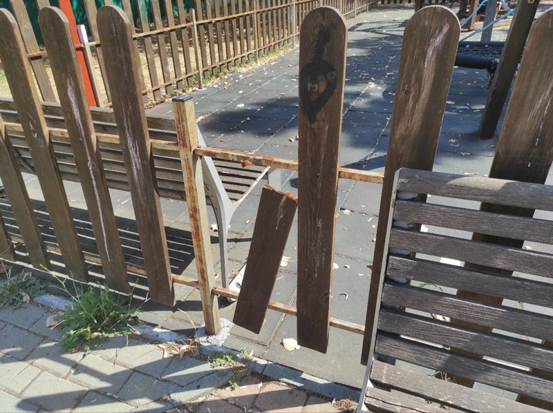 - Счупени, липсващи или разхлабени компоненти на люлки, пързалки и други конструкции