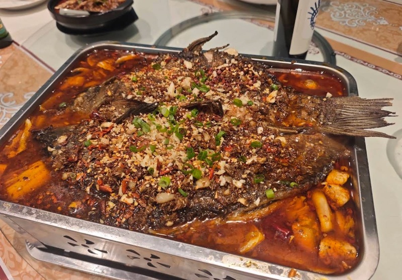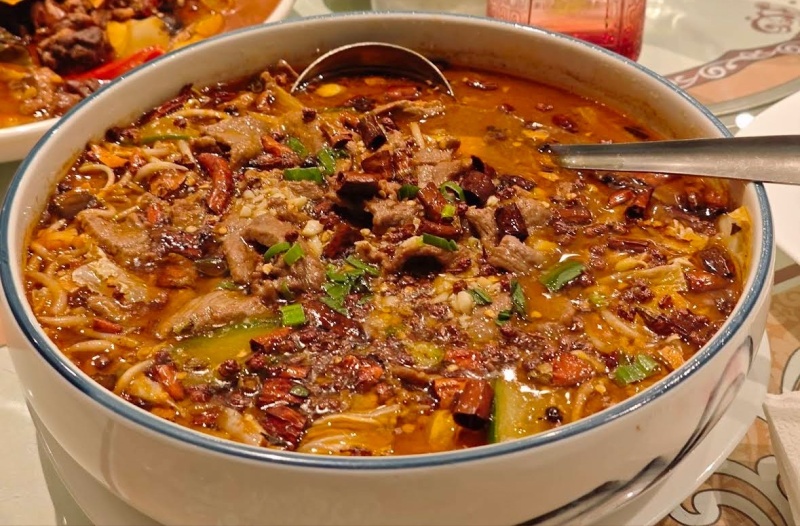 Съчуанско варено говеждо (shuizhu roupian). Въпреки простото име ястието е много специално – тънки парчета крехко месо се приготвят в ароматен лютив бульон с чили и съчуански пипер. Накрая се залива с горещо олио, което освобождава силен аромат. Вкусът е едновременно лютив, ароматен и много наситен, месото е крехко и сочно, чудесно в комбинация с ориз.