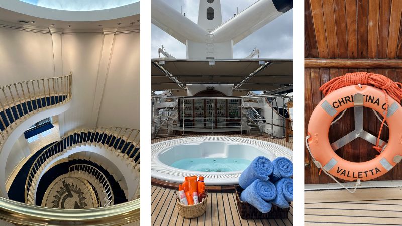„Христина“ е дълга почти сто метра, разполага със 17 луксозни каюти и може да приеме 34 пътници. Яхтата е малък плаващ хотел - има спа, джакузи, киносалон, фитнес. Дъното на басейна на палубата е украсено с мозайка на митичния Минотавър. Само с натискането на едно копче водата в басейна изчезва и мястото се преобразява в дансинг. На яхтата готвят шестима шеф готвачи от различни националности, които всекидневно изготвят изискано меню.