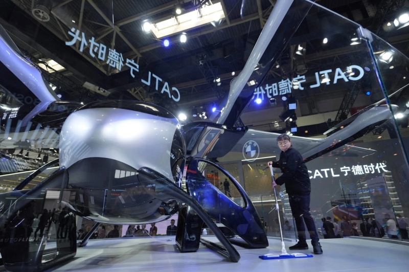Чистачка работи близо до прототип на летящ автомобил от китайския гигант в производството на батерии CATL.