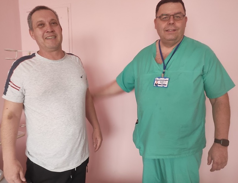На снимките: д-р Костадин Петков с пациента Иван Енев и по време на лапароскопска операция заедно с колега от отделението - д-р Станислав Марангозов